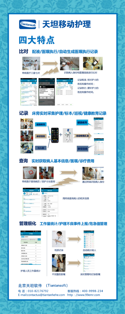 天坦移動護理系統(tǒng)改變傳統(tǒng)護理工作模式。將審藥、配藥、治療等環(huán)節(jié)實現(xiàn)移動化、條碼化、共享化。確保信息準確,用藥安全;系統(tǒng)將護理工作變得更方便、更自由,護士可以在任何地點調取病歷、化驗報告、檢查影像,利用各種移動終端完成醫(yī)囑執(zhí)行、床前護理文書錄入等護理操作,極大地減少護理管理人員的工作量,提高整個護理工作的工作效率與醫(yī)療質量。