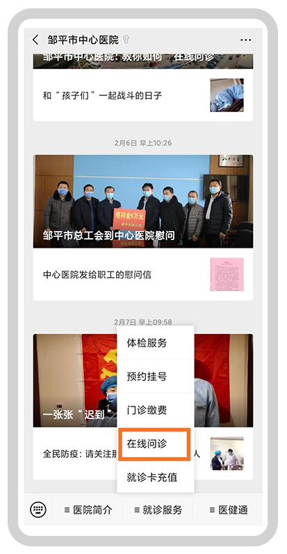 微信公眾號(hào)搜索:鄒平市中心醫(yī)院,或掃描醫(yī)院二維碼,關(guān)注公眾號(hào)。