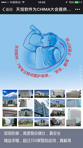 通過(guò)這樣一年一度高規(guī)格的國(guó)家級(jí)盛會(huì),加強(qiáng)了移動(dòng)醫(yī)療行業(yè)的交流與合作,推動(dòng)了移動(dòng)醫(yī)療產(chǎn)業(yè)健康可持續(xù)發(fā)展。同時(shí)激勵(lì)著天坦軟件要為移動(dòng)醫(yī)療做出更大的貢獻(xiàn),正如與會(huì)專家對(duì)天坦軟件的評(píng)價(jià)一樣 “渴了就喝天坦特供水,“天然、健康、安全、解渴”的產(chǎn)品,才是好產(chǎn)品”。