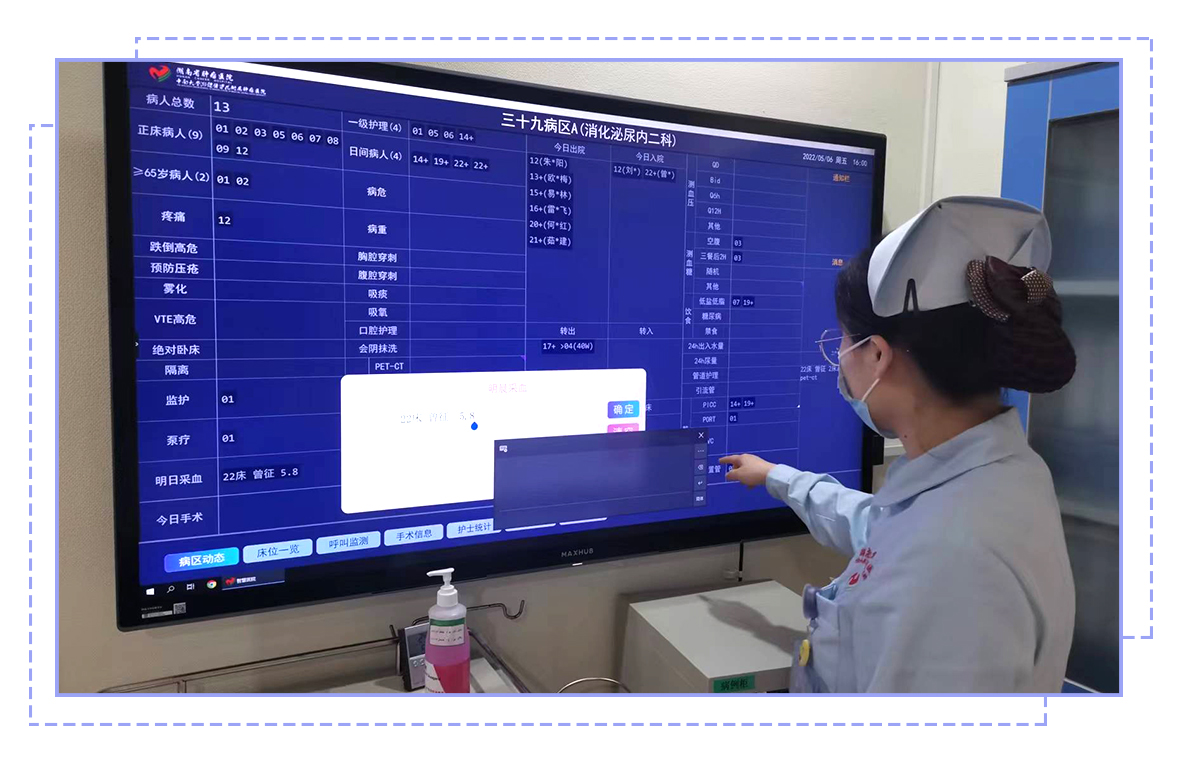 智能交互大屏作為整個(gè)病區(qū)的中心,展示病區(qū)所有患者信息的護(hù)理信息,代替了傳統(tǒng)的白板記錄,并且可以查看病區(qū)患者簡卡及患者動(dòng)態(tài),對病區(qū)內(nèi)需手術(shù)患者信息展示、護(hù)士交接班信息展示,使管理人員可以做到心中有數(shù),合理分配工作,還可對病區(qū)數(shù)據(jù)統(tǒng)計(jì),如患者呼叫統(tǒng)計(jì)、護(hù)士信息統(tǒng)計(jì)、值班動(dòng)態(tài)統(tǒng)計(jì),從而建立一個(gè)有序的醫(yī)療環(huán)境。