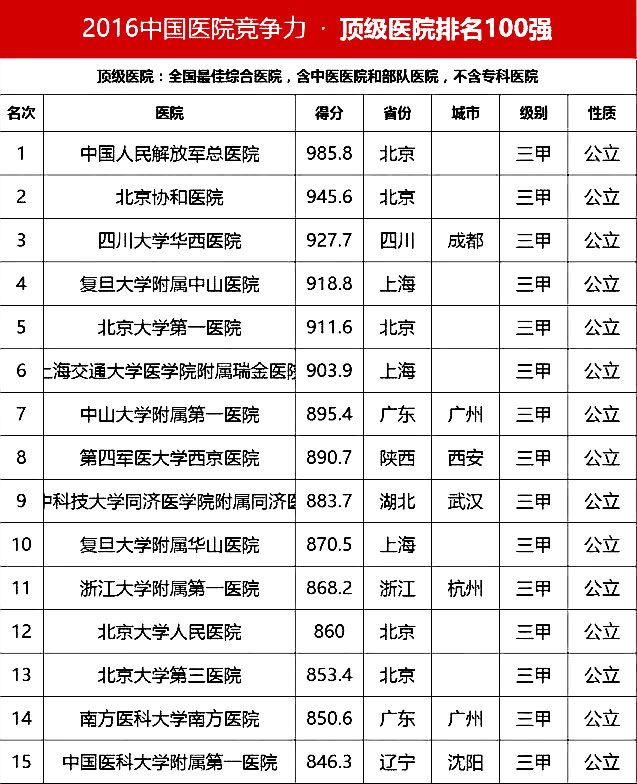 “頂級醫(yī)院100強”采用的排名指標體系包括四個方面:醫(yī)院最優(yōu)規(guī)模(實開床位數(shù)、年門急診量、年出院量、全院人數(shù));醫(yī)療技術(shù)(正高職稱人數(shù)/全院人數(shù)、全院醫(yī)師人數(shù)/實開床位數(shù)、醫(yī)療設備資產(chǎn)/總資產(chǎn)、年住院手術(shù)量/年出院量、國家級衛(wèi)紀委臨床重點專科/總??茣?、ICU床占比);醫(yī)院運行(平均住院天數(shù)、床位使用率、門診均次費用/當?shù)厝司鵊DP、住院均次費用/當?shù)厝司鵊DP、外省住院病人占比);學術(shù)影響力(院士人數(shù)、學術(shù)領袖占比、教育部重點學科及重點實驗室/總??茢?shù)、本年度獲國家自然科學基金項目數(shù)量和總?cè)~)。