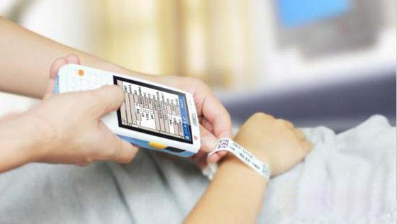 5月15日,記者來到心內(nèi)科病房時,孫洪巧正拿著移動護理終端(PDA)巡房。只見她拿著PDA在病人手腕上一掃,然后把量好的體溫、血壓數(shù)據(jù)輸入PDA,巡房工作就完成了,速度之快連病人都有些不習慣。