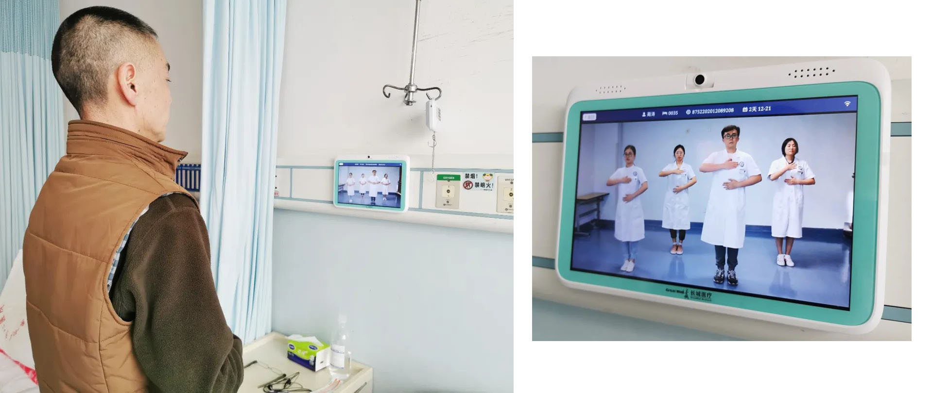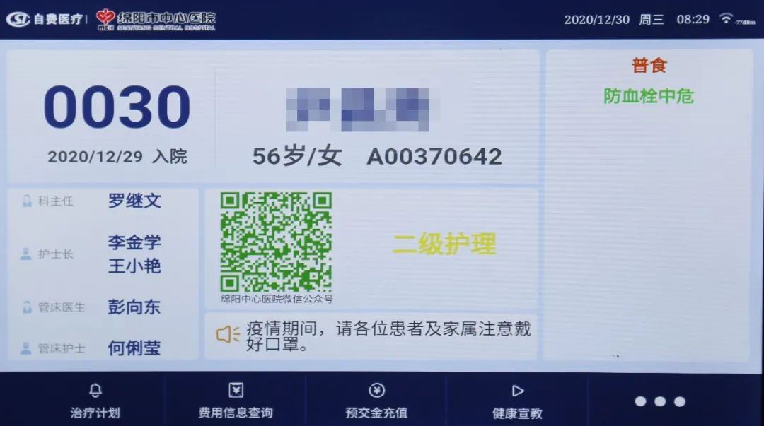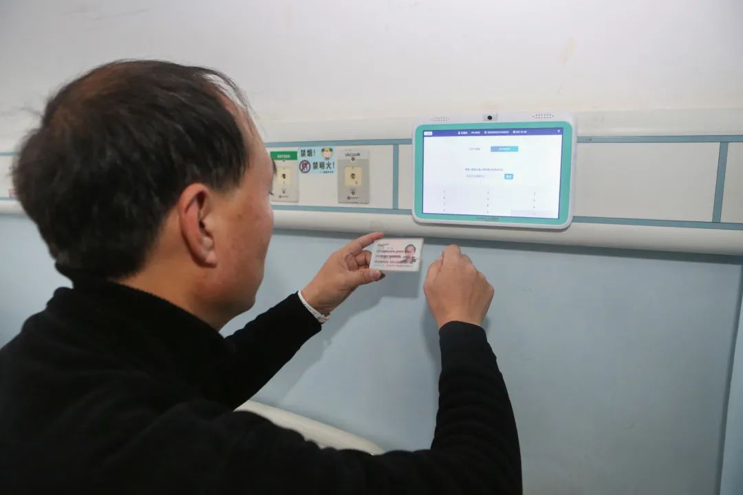 在市中心醫(yī)院心胸外科病房,剛?cè)朐旱牧质迨逭龑χ〈泊差^的電子屏幕跟著醫(yī)護人員一起做呼吸訓練操……林叔叔因肺部結(jié)節(jié)入院準備手術(shù),術(shù)前術(shù)后的呼吸訓練能幫助他快速康復(fù),“以前我們會把患者集中組織起來教他們做呼吸訓練操,但是可能學一次就忘了,現(xiàn)在我們把這些健教視頻放在患者床頭的電子屏上,患者可隨時可以點進去跟著練習,”護士長李金學介紹,“除此之外,林叔叔還可以通過這塊屏幕實現(xiàn)診療計劃查詢、床旁掃碼繳費、費用明細查詢……以后我們還想利用這套信息系統(tǒng)完成床旁結(jié)算,患者從住院到出院,在病房就能一站式完成。”